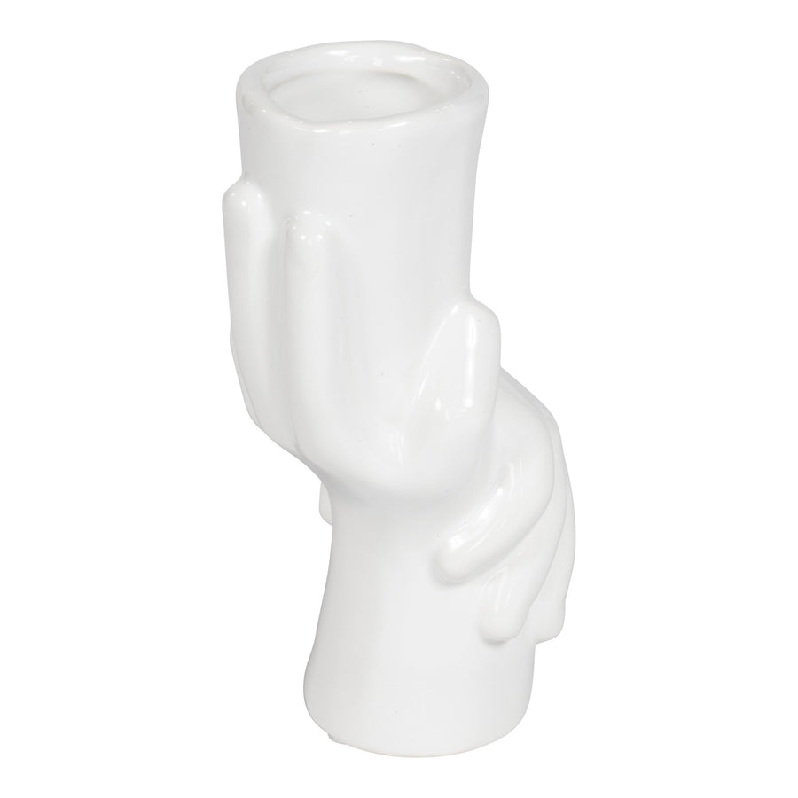 Elevate your decor with this modern white ceramic vase featuring a unique holding hands design.